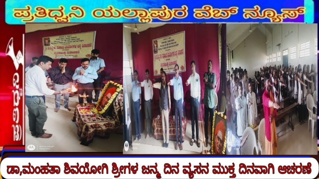 ಅವರು ಪಟ್ಟಣದ ಸರ್ಕಾರಿ ಪ್ರಥಮದರ್ಜೆ ಕಾಲೇಜಿನಲ್ಲಿ ತಾಲೂಕಾ ಆಡಳಿತ ಯಲ್ಲಾಪುರ ಹಾಗೂ ಕಾಲೇಜಿನ ಯುವ ರೆಡ್ಕ್ರಾಸ್ ಘಟಕದ ಸಂಯುಕ್ತ ಆಶ್ರಯದಲ್ಲಿ ಡಾ. ಮಹಾಂತ ಶಿವಯೋಗಿಗಳ ಜನ್ಮದಿನದ ಪ್ರಯುಕ್ತ ವ್ಯಸನ ಮುಕ್ತ ದಿನಾಚರu ಕಾರ್ಯಕ್ರಮದಲ್ಲಿ ಮುಖ್ಯತಿಥಿಗಳಾಗಿ ಭಾಗವಹಿಸಿ ಮಾತನಾಡಿದರು. ಕಾರ್ಯಕ್ರಮದ ಪ್ರಾರಂಭದಲ್ಲಿ ಡಾ. ಮಹಾಂತ ಶಿವಯೋಗಿಗಳ ಭಾವಚಿತ್ರಕ್ಕೆ ಪುಷ್ಪಾರ್ಚನೆ ಮಾಡಲಾಯಿತು.