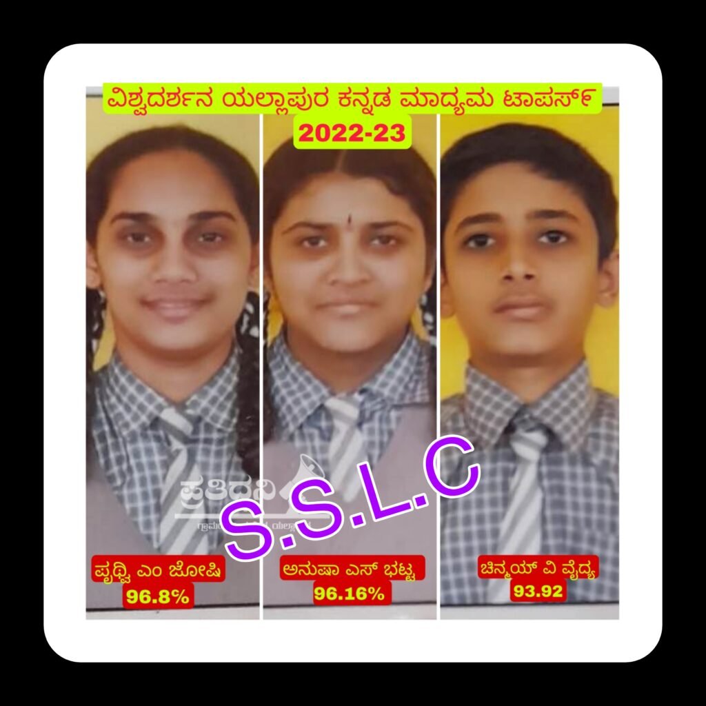 ಪ್ರತಿಧ್ವನಿ,ಯಲ್ಲಾಪುರ : ಪಟ್ಟಣದ ವಿಶ್ವದರ್ಶನ ಕನ್ನಡ ಮಾಧ್ಯಮ ಪ್ರೌಢಶಾಲೆಯ ಪ್ರಸಕ್ತ ಸಾಲಿನ ಎಸ್.ಎಸ್.ಎಲ್.ಸಿ ಫಲಿತಾಂಶ ಶೇ.94 ಆಗಿದ್ದು, ಪೃಥ್ವಿ ಎಂ.ಜೋಷಿ (96.8%), ಅನುಷಾ ಎಸ್. ಭಟ್ಟ (96.16%), ಚಿನ್ಮಯ ವಿ. ವೈದ್ಯ (93.92%) ಅನುಕ್ರಮ ಸ್ಥಾನ ಪಡೆದಿದ್ದಾರೆ. ಪರೀಕ್ಷೆಗೆ ಕುಳಿತ ವಿದ್ಯಾರ್ಥಿಗಳಲ್ಲಿ ಪ್ರಥಮ ಭಾಷೆ ಕನ್ನಡದಲ್ಲಿ ಐವರು ಹಾಗೂ ಹಿಂದಿಯಲ್ಲಿ ಮೂವರು ವಿದ್ಯಾರ್ಥಿಗಳು ಶೇ.100 ಅಂಕ ಪಡೆದಿದ್ದಾರೆ.