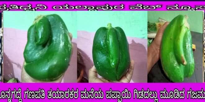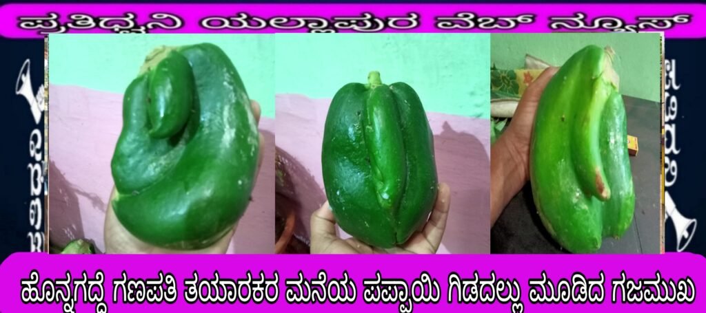 ಪ್ರತಿಧ್ವನಿ ಯಲ್ಲಾಪುರ : ತಾಲೂಕಿನ ಹೊನ್ನಗದ್ದೆ ನಿವಾಸಿ ಉತ್ತಮ ಅಂಬಿಗ ಎಂಬ ಪ್ರಸಿದ್ಧ ಗಣಪತಿ ತಯಾರಕರೊಬ್ಬರ ಮನೆಯಲ್ಲಿ ಬೆಳೆದ ಪಪ್ಪಾಯಿ ಗಿಡದಲ್ಲಿ ಬೆಳೆದ ಕಾಯಿಗಳೆಲ್ಲ ಗಣಪನ ಹೋಲಿಕೆ ಮೂಡಿರುವುದು ವಿಶೇಷವಾಗಿದೆ.