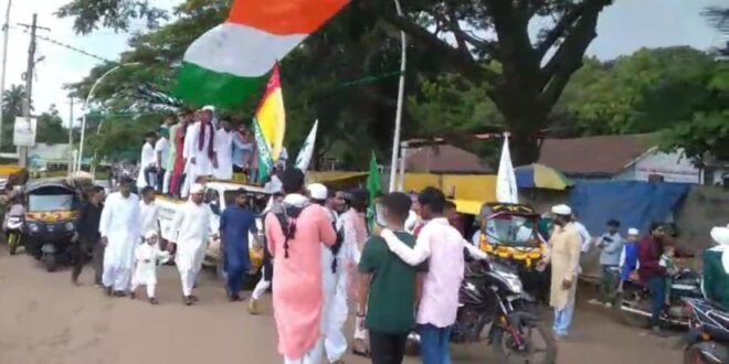 ಪ್ರತಿಧ್ವನಿ ಯಲ್ಲಾಪುರ : ಪಟ್ಟಣದಲ್ಲಿ ಸೆ,28 ರ ಗುರುವಾರದಂದು ಮುಸ್ಲಿಂ ಸಮೂದಾಯದ ಈದ್-ಮಿಲಾದ್ ಆಚರಣೆ ಸಂದರ್ಭದಲ್ಲಿ ಅದ್ದೂರಿಯಾಗಿ ಮೆರವಣಿಗೆ ನಡೆಸಿ ಸಂಭ್ರಮಿಸದ್ದರು. ಈ ನಡುವೆ ಮೆರವಣಿಗೆಯಲ್ಲಿ ಭಾರತದ ರಾಷ್ಟ್ರ ಧ್ವಜದ ಮಾದರಿಯಲ್ಲಿ ಮದ್ಯದ ಬಿಳಿ ಬಣ್ಣದ ಭಾಗದಲ್ಲಿ ಮುಸ್ಲಿಂ ಸಮೂದಾಯದ ಗುರುತನ್ನಿಟ್ಟು ರಾಷ್ಟ್ರ ಧ್ವಜಕ್ಕೆ ಅಪಮಾನ ಮಾಡಿದ್ದಾರೆ.