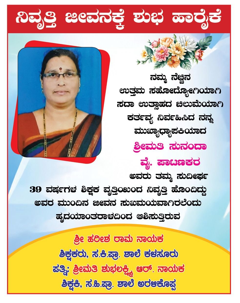 ಅವರು ಪಟ್ಟಣದ ಕಾಳಮ್ಮನಗರದ ಸ.ಹಿ.ಪ್ರಾ. ಶಾಲೆಯ ಪದೋನ್ನತ ಮುಖ್ಯಾಧ್ಯಾಪಕಿ ಸುನಂದಾ ವೈ ಪಾಟಣಕರ ಅವರ ವಯೋನಿವೃತ್ತಿ ಬೀಳ್ಕೊಡುಗೆ ಸಮಾರಂಭ ಉದ್ಘಾಟಿಸಿ ಮಾತನಾಡಿದರು.
