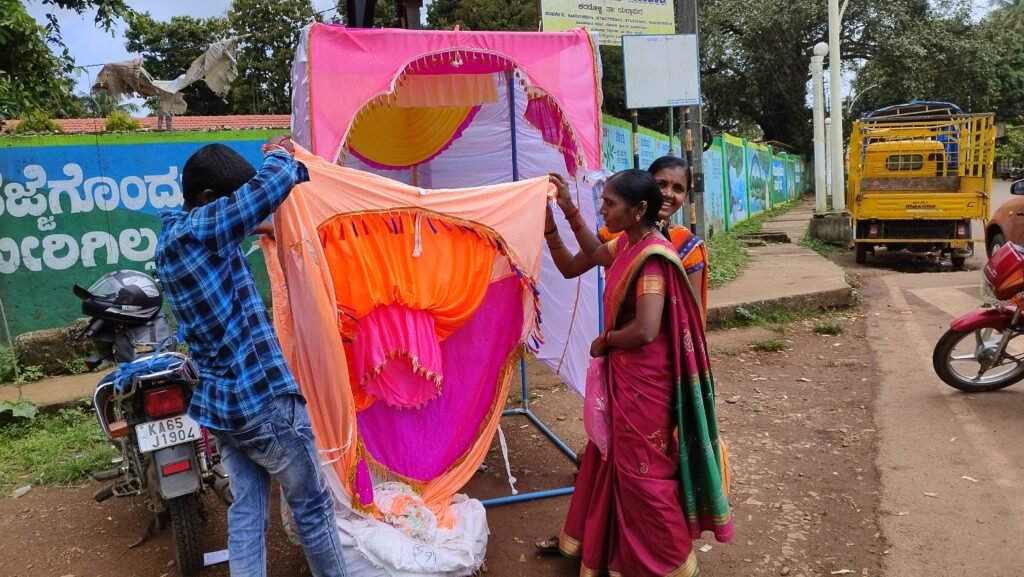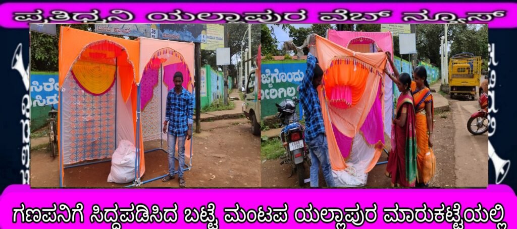 ಯಲ್ಲಾಪುರ : ಚೌತಿ ಗಣಪನ ಹಬ್ಬಕ್ಕೆ ದಿನಗಣನೆ ಆರಂಭವಾಗುತತಿದ್ದಂತೆ ಗಜಮುಖನ ಆಹ್ವಾನಕ್ಕೆ ಸಕಲ ತಯಾರಿಗಳ ಸಿದ್ಧತೆ, ಅಲಂಕಾರಿಕ ಸಾಮಗ್ರಿಗಳು ಮಾರುಕಟ್ಟೆಗೆ ಬಂದಿದ್ದು ಯಲ್ಲಾಪುರದ ರವಿವಾರ ಸಂತೆಯಲ್ಲಿ ಗಣೇಶನನ್ನು ಕೂರಿಸುವ ರೆಡಿಮೇಡ್ ಮಂಟಪಗಳ ಮಾರಾಟ ಎಲ್ಲರ ಗಮನ ಸೆಳೆಯಿತು.