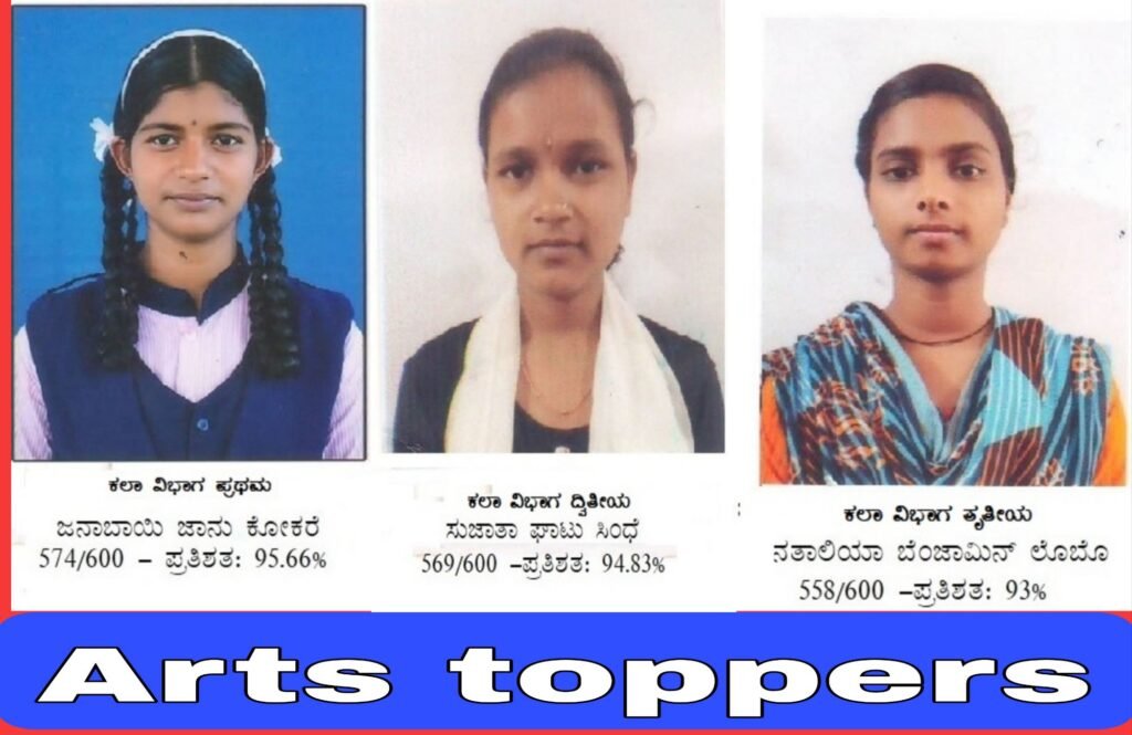 ಕಲಾ ವಿಭಾಗದ ಜನಾಬಾಯಿ ಕೊಕರೆ 574 ಪ್ರಥಮ, ಸುಜಾತಾ ಸಿಂಧೆ 569 ದ್ವಿತೀಯ, ನತಾಲಿಯಾ ಲೊಬೊ 558 ತೃತೀಯ ಸ್ಥಾನ ಪಡೆದಿದ್ದಾರೆ.
