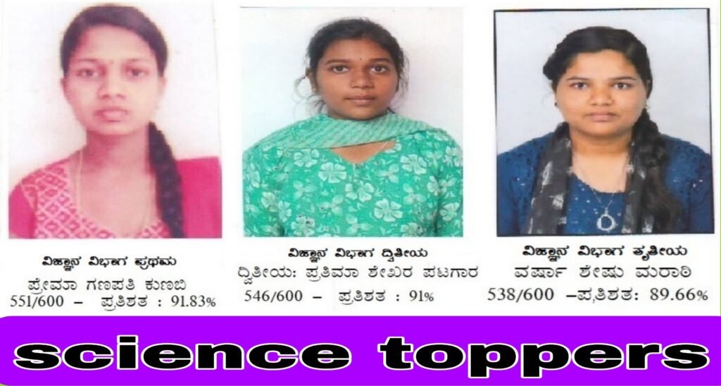 ವಿಜ್ಞಾನ ವಿಭಾಗದ ಪ್ರೇಮಾ ಕುಣಬಿ 551 ಪ್ರಥಮ , ಪ್ರತಿಮಾ ಪಟಗಾರ 546 ದ್ವಿತೀಯ , ವರ್ಷಾ ಮರಾಠಿ 538 ಅಂಕಗಳನ್ನು ಪಡೆದು ತೃತೀಯ ಸ್ಥಾನ ಗಳಿಸಿ ಸಾಧನೆ ಮಾಡಿದ್ದಾರೆ ಎಂದು ಪ್ರಾಚಾರ್ಯ ಎಸ್.ಟಿ.ವೈದ್ಯ ತಿಳಿಸಿದ್ದು ಉತ್ತೀರ್ಣರಾದ ಎಲ್ಲಾ ವಿದ್ಯಾರ್ಥಿಗಳಿಗೆ ಕಾಲೇಜು ಅಭಿವೃದ್ಧಿ ಮಂಡಳಿ , ಪ್ರಾಚಾರ್ಯರು, ಉಪನ್ಯಾಸಕರು, ಊರ ನಾಗರಿಕರು ಅಭಿನಂದಿಸಿದ್ದಾರೆ.