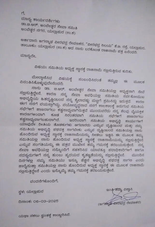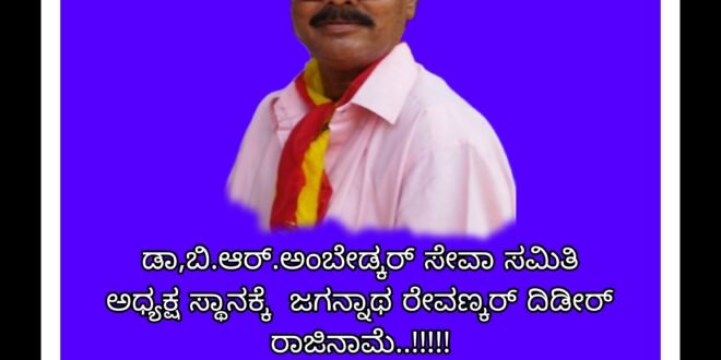 ಯಲ್ಲಾಪುರ – ತಾಲೂಕಿನ ಪ್ರತಿಷ್ಠಿತ ಸಂಘದಲೊಂದಾದ ಡಾ,ಬಿ.ಆರ್.ಅಂಬೇಡ್ಕರ್ ಸೇವಾ ಸಮಿತಿ ಅಧ್ಯಕ್ಷ ಸ್ಥಾನಕ್ಕೆ ಬಹು ದೀರ್ಘ ಸಮಯದಿಂದ ಕ್ರಿಯಾಶೀಲ ಅಧ್ಯಕ್ಷರಾಗಿ ಕಾರ್ಯ ನಿರ್ವಹಿಸುತ್ತಿದ್ದ ಜಗನ್ನಾಥ ರೇವಣಕರ ಅವರು ತಮ್ಮ ಸ್ಥಾನಕ್ಕೆ ರಾಜೀನಾಮೆ ಸಲ್ಲಿಸಿದ್ದಾರೆ.