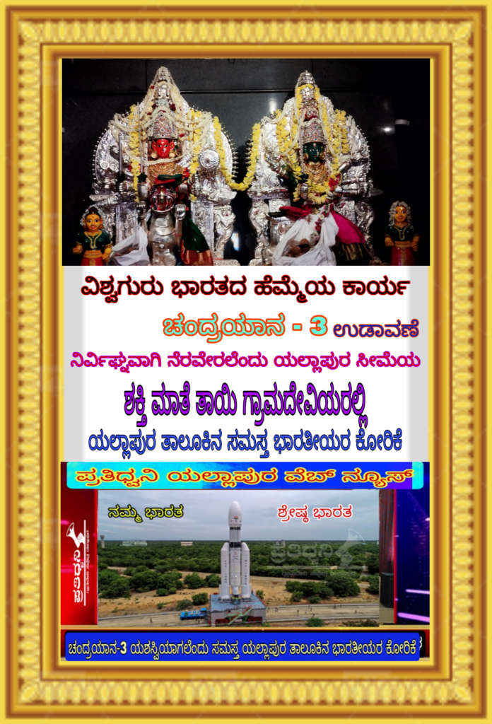 ಇದು ಪ್ರತಿಧ್ವನಿ ಯಲ್ಲಾಪುರದ ಕಳಕಳಿ.. ತಪ್ಪದೆ ದೇಶದ 140 ಕೋಟಿ ಭಾರತೀಯರ 280 ಕೋಟಿ ಕಣ್ಣುಗಳು ಎದುರು ನೋಡುತ್ತಿದೆ ಚಂದ್ರಯಾನ-3 ರ ಉಡಾವಣೆಯ ಕ್ಷಣಗಳನ್ನು ವಿದ್ಯಾರ್ಥಿಗಳು ಕಣ್ತುಂಬಿಕೊಳ್ಳಲು ಶಿಕ್ಷಣ ಇಲಾಖೆ ಅವಕಾಶ ಮಾಡಿಕೊಡಬೇಕು. ಸಾದ್ಯವಾದಷ್ಟು ಸಾರ್ವಜನಿಕರು ಈ ಸನ್ನಿವೇಶ ನೀಡಲೆ ಬೇಕಿದೆ ಕಾರಣ ಇದು ನಮ್ಮ ದೇಶದ ಹೆಮ್ಮೆಯ ವಿಜ್ಞಾನಿಗಳ ಹಗಲು ರಾತ್ರಿಯ ಪರಿಶ್ರಮವಿದೆ ನಮ್ಮ ರಾಷ್ಟ್ರ ನಮ್ಮ ಹೆಮ್ಮೆ ಅಲ್ವ