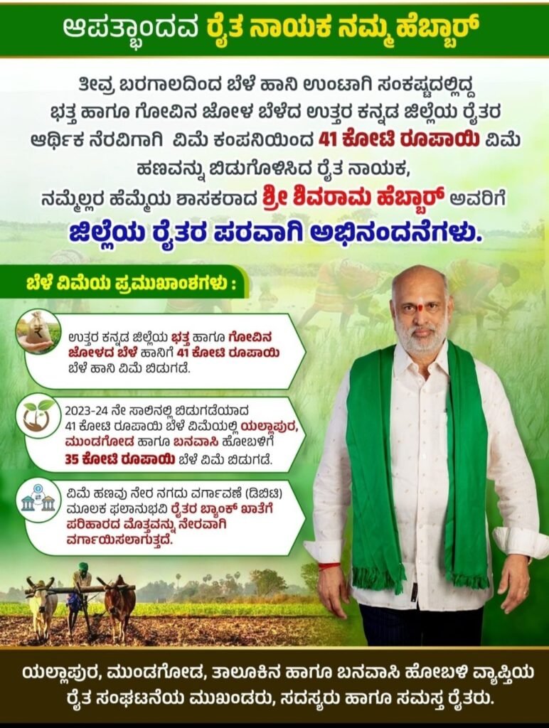 ಜಿಲ್ಲೆಯ ರೈತರ ಖಾತೆಗೆ ಕೆ.ಡಿ.ಸಿ.ಸಿ ಬ್ಯಾಂಕ್ ಮೂಲಕ 41 ಕೋಟಿ ರೂಪಾಯಿ ಭತ್ತ ಹಾಗೂ ಗೋವಿನ ಜೋಳದ ಬೆಳೆ ಹಾನಿ ವಿಮೆ ಜಮಾ ಯಲ್ಲಾಪುರ ಕ್ಷೇತ್ರಕ್ಕೆ ಸಿಂಹಪಾಲು 35 ಕೋಟಿ ರೂಪಾಯಿ ವಿಮೆ ಬಿಡುಗಡೆ – ಹೆಬ್ಬಾರ್