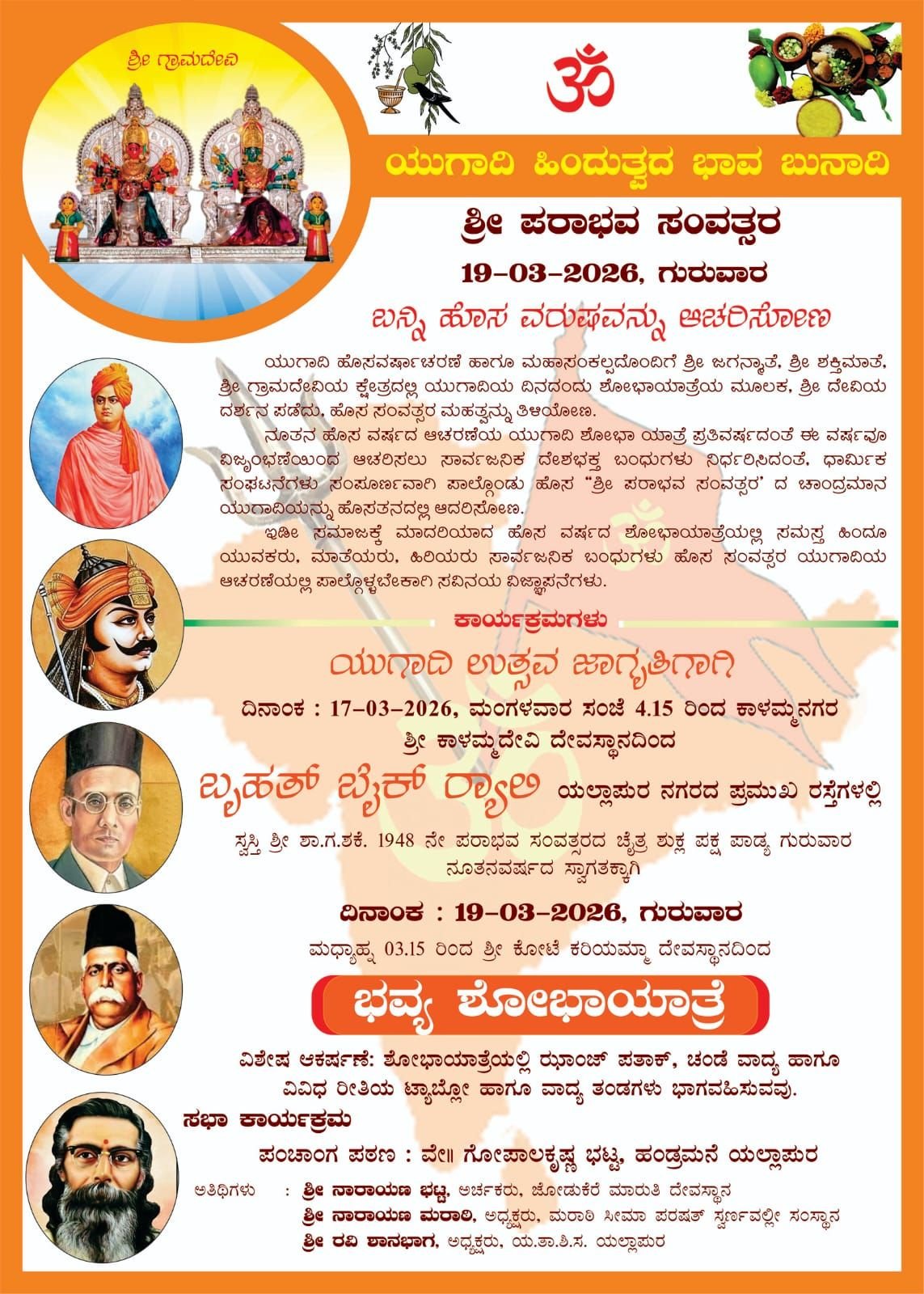 19 ನೆ ತಾರೀಖು ನಡೆಯಲಿರುವ ಯುಗಾದಿ ಶೋಭಾಯಾತ್ರೆಯಲ್ಲಿ ಹಿಂದು ಬಾಂಧವರು ಕಟಿಬದ್ದರಾಗಿ ಪಾಲ್ಗೊಂಡರೆ ಯಲ್ಲಾಪುರದ ರಸ್ತೆಯಲ್ಲಿ ನಿಲ್ಲಲು ಸ್ಥಳವಿಲ್ಲದಂತಾಗಲಿದೆ ಆದರೆ ಯಾರಲ್ಲು ಭಾಗವಹಿಸಲೇಬೇಕೆಂಬ ಬದ್ದತೆಯಾಗಲಿ ನಮ್ಮ ಧಾರ್ಮಿಕ ಉತ್ಸವ ಎಂಬ ಪ್ರೀತಿಯಾಗಲಿ ಇಲ್ಲದಂತಾಗಿರುವುದು ದುರಂತವಾಗಿದೆ.