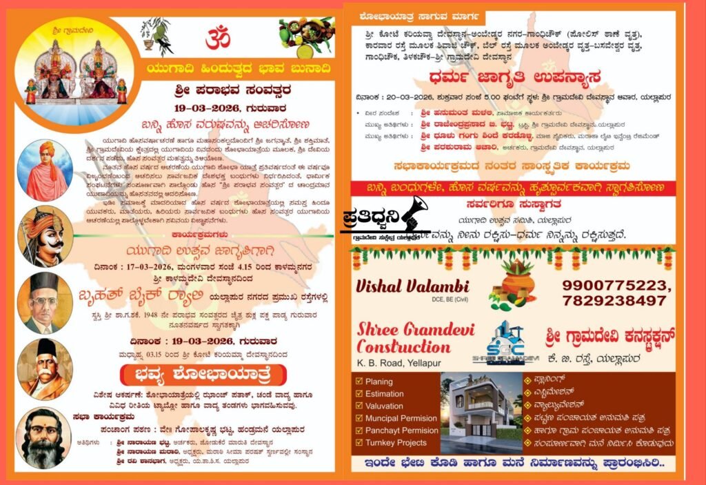 ಪ್ರತಿಧ್ವನಿ ಯಲ್ಲಾಪುರ : ಯುಗಾದಿ ಸಂಭ್ರಮಾಚರಣೆಯ ಪ್ರಮುಖ ಘಟ್ಟ ಪಂಚಾಂಗ ಪಠಣ- ವೇ.ಪಂ.ಗೋಪಾಲಕೃಷ್ಣ ಭಟ್ ಹಂಡ್ರಮನೆ ಅವರಿಗೆ ಸಮಿತಿ ಅಧ್ಯಕ್ಷ ವಿಶಾಲ್ ವಾಳಂಬಿಯವರಿಂದ ಗೌರವದ ಆಹ್ವಾನ. , ಯುಗಾದಿ ಉತ್ಸವಕ್ಕೆ ರಂಗು ತುಂಬಲು ಸಮಿತಿ ಉಪಾಧ್ಯಕ್ಷ ಮಹೇಶ್ ನಾಯ್ಕ್ ನೇತೃತ್ವದಲ್ಲಿ ರವೀಂದ್ರ ನಗರದಲ್ಲಿ ಕೇಸರಿ ಪತಾಕೆ ಸಂಭ್ರಮ. ವಿಜಯ್ ಮಿರಾಶಿ ನೇತೃತ್ವದಲ್ಲಿ ಯುಗಾದಿ ಉತ್ಸವದ ಯಶಸ್ಸಿಗೆ ವಿಷ್ಣು ಸಮಾಜದಿಂದ 51,000 ಆರ್ಥಿಕ ದೇಣಿಗೆ.