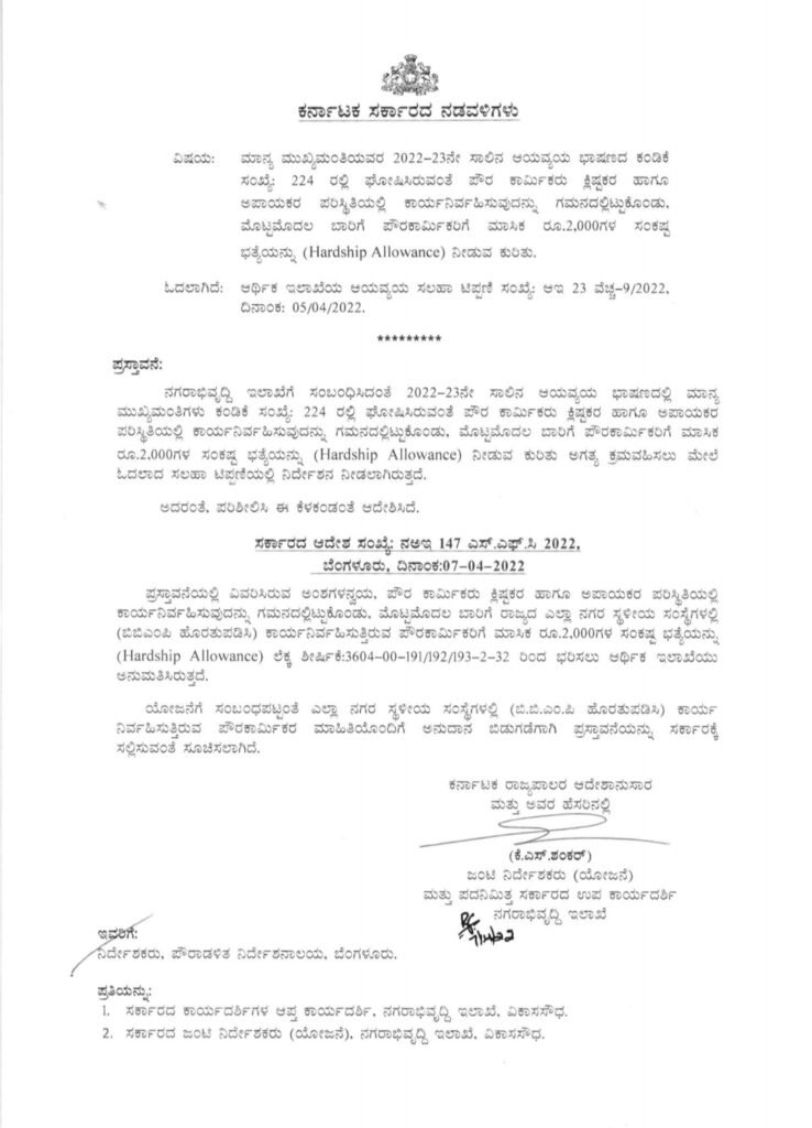 ಇಂತಹ ಕ್ಲಿಷ್ಟಕರ ಪರಿಸ್ಥಿತಿಯಲ್ಲಿ ಕಾರ್ಯ ನಿರ್ವಹಿಸುವುದನ್ನು ಗಮನದಲ್ಲಿಟ್ಟುಕೊಂಡು ಈ ಹಿಂದಿನ ಬಿಜೆಪಿ ಸರ್ಕಾರದಲ್ಲಿ ಮುಖ್ಯಮಂತ್ರಿ ಬಸವರಾಜ ಬೊಮ್ಮಾಯಿ ಮಂಡಿಸಿದ ಆಯವ್ಯಯ ಸಂದರ್ಭದ ಭಾಷಣದಲ್ಲಿ ಮೊಟ್ಟ ಮೊದಲ ಬಾರಿಗೆ ಪೌರಕಾರ್ಮಿಕರಿಗೆ ಸಂಕಷ್ಟ ಭತ್ಯೆ ಘೋಷಿಸಿದ್ದರು. ಈ ಯೋಜನೆಗೆ ಆರ್ಥಿಕ ಇಲಾಖೆಯೂ ಒಪ್ಪಿಗೆ ನೀಡಿತ್ತು.