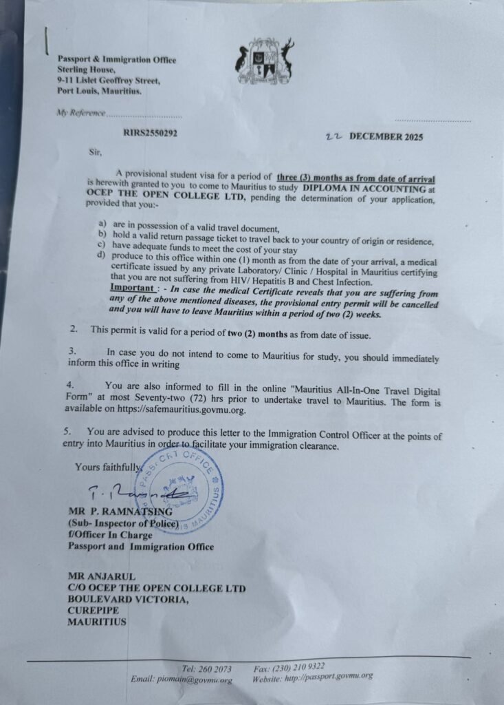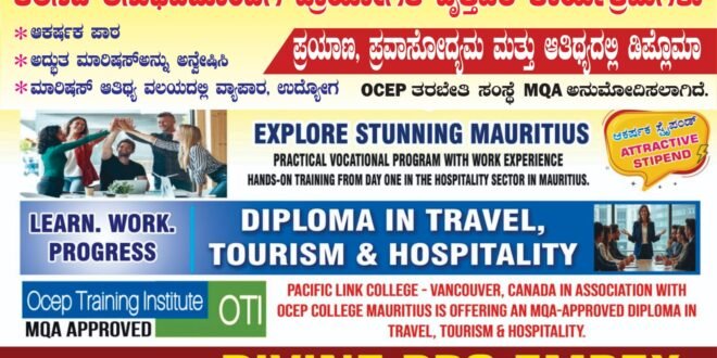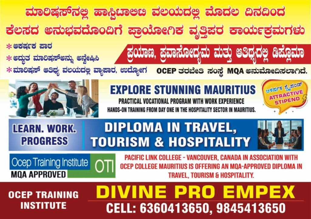 - ಮಾರಿಷಸ್ ದೇಶದಲ್ಲಿ ಮಾರಿಷಸ್ ಸರ್ಕಾರದ ಮಾನ್ಯತೆ ಪಡೆದಿರುವ ಎಂ.ಕ್ಯೂ.ಎ ಅನುಮೋದಿತ ಒ.ಸಿ.ಇ.ಪಿ ತರಬೇತಿ ಸಂಸ್ಥೆ ಅಡಿಯಲ್ಲಿ ಎರಡು ವರ್ಷಗಳ ಪ್ರಯಾಣ, ಪ್ರವಾಸೋದ್ಯಮ ಮತ್ತು ಆತಿಥ್ಯ ವಿಭಾಗದಲ್ಲಿ ಡಿಪ್ಲಮೋ ಕೋರ್ಸ್ ಆರಂಬಿಸಿದ್ದು ಎಸ್.ಎಸ್.ಎಲ್.ಸಿ / ದ್ವಿತೀಯ ಪಿಯುಸಿ ಉತ್ತೀರ್ಣರಾದವರು ಈ ಕೋರ್ಸ್ ಆಯ್ಕೆ ಮಾಡಿಕೊಳ್ಳಬಹುದಾಗಿದೆ.