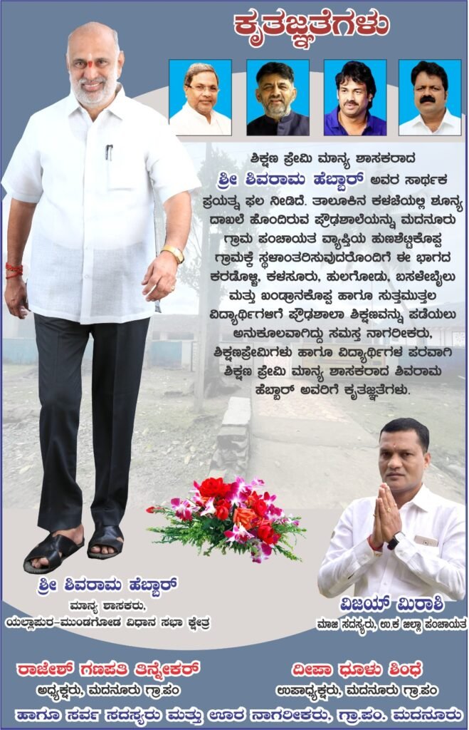 ಶಾಸಕ ಶಿವರಾಮ ಹೆಬ್ಬಾರ್ ಅವರು ಕಳಚೆ ಪ್ರೌಢಶಾಲೆಯನ್ನು ಹುಣಶೆಟ್ಟಿಕೊಪ್ಪ ಗ್ರಾಮಕ್ಕೆ ಸ್ಥಳಾಂತರಿಸಿದ ಹಿನ್ನೆಲೆಯಲ್ಲಿ ಮುಖ್ಯಮಂತ್ರಿ ಸಿದ್ದರಾಮಯ್ಯ , ಉಪಮುಖ್ಯಮಂತ್ರಿ ಡಿ.ಕೆ ಶಿವಕುಮಾರ್ , ಶಿಕ್ಷಣ ಸಚಿವ ಮಧು ಬಂಗಾರಪ್ಪ ಹಾಗೂ ಜಿಲ್ಲಾ ಉಸ್ತುವಾರಿ ಸಚಿವ ಮಂಕಾಳು ವೈದ್ಯ ಅವರಿಗೆ ಈ ಭಾಗದ ವಿದ್ಯಾರ್ಥಿಗಳು ಹಾಗೂ ಪಾಲಕರ ಪರವಾಗಿ ಅಭಿನಂದನೆಯನ್ನು ಸಲ್ಲಿಸಿದ್ದಾರೆ.