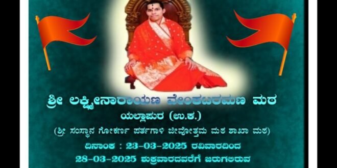 ಯಲ್ಲಾಪುರ : ಪಟ್ಟಣದ ಪ್ರತಿಷ್ಠಿತ ” ಶ್ರೀ ಲಕ್ಷ್ಮೀ ನಾರಾಯಣ ವೆಂಕಟರಮಣ ಮಠ ” ದಲ್ಲಿ 42 ನೆ ಪ್ರತಿಷ್ಟಾ ವರ್ಧಂತಿ ಉತ್ಸವವು ಸತತ 5 ದಿನಗಳ ಕಾಲ ವಿಶೇಷ ಧಾರ್ಮಿಕ ವಿಧಿ ವಿಧಾನಗಳು ಜರುಗಲಿದೆ. ಸದ್ಬಕ್ತರು ಸರ್ವ ಕಾರ್ಯಗಳಲ್ಲಿ ಪಾಲ್ಗೊಂಡು ಶ್ರೀ ಹರಿ ಶ್ರೀ ಗುರುಗಳ ಕೃಪೆಗೆ ಪಾತ್ರರಾಗಬೇಕೆಂದು ಶ್ರೀ ಮಠದ ಆಡಳಿತ ಮಂಡಳಿ ಕರೆ ನೀಡಿದೆ.