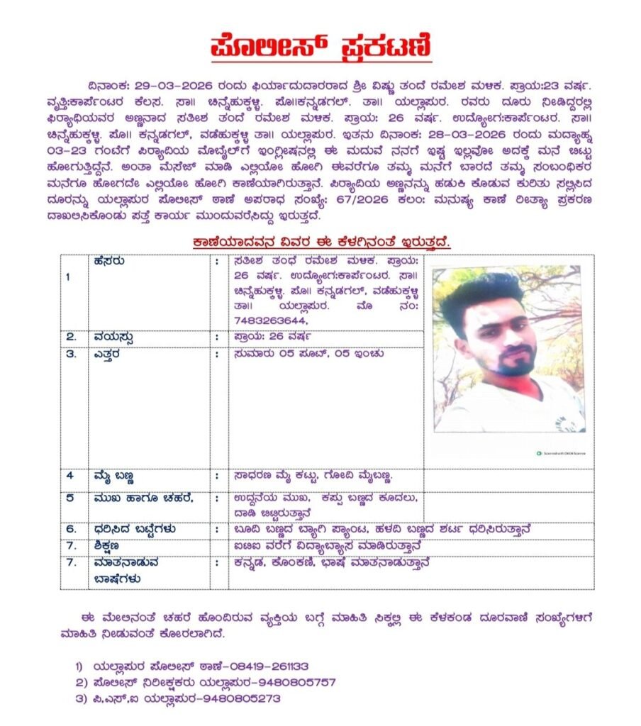 ಸತೀಶ ರಮೇಶ ಮಳಿಕ (26) ಎಂಬ ಯುವಕನೆ ಕಾಣೆಯಾದವನಾಗಿದ್ದು ತನ್ನ ತಮ್ಮವಿಷ್ಣು ಮಳಿಕನ ಮೊಬೈಲ್ ಗೆ ನನಗೆ ಮದುವೆ ಇಷ್ಟವಿಲ್ಲ ಎಂಬ ಮೆಸೇಜ್ ಒಂದನ್ನು ಮಾ,28 ರಂದು ಕಳಿಸಿ ಮನೆಯಿಂದ ಹೊರ ನಡೆದವನು ನೆಂಟರಿಷ್ಟರ ಮನೆಗು ಹೋಗದೆ, ಮರಳಿ ಮನೆಗು ಬಾರದೆ ಕಾಣೆಯಾಗಿದ್ದಾನೆ ಈ ಸಂಬಂಧ ಯಲ್ಲಾಪುರ ಠಾಣೆಯಲ್ಲಿ ದೂರು ದಾಖಲಾಗಿದೆ.