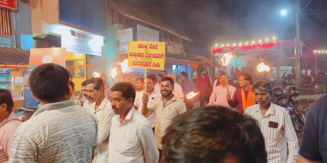 ಯಲ್ಲಾಪುರ : ತಾಲೂಕಿನ ಮದನೂರಿನಲ್ಲಿ ನಡೆದ ಅಪ್ರಾಪ್ತೆ ಮೇಲೆ ಅತ್ಯಾಚಾರ ಪ್ರಕರಣ ಖಂಡಿಸಿ, ಆರೋಪಿಗೆ ಅತ್ಯಂತ ಕಠಿಣ ಶಿಕ್ಷೆಗೆ ಆಗ್ರಹಿಸಿ ತಾಲೂಕು ಬಿಜೆಪಿ ಘಟಕವು ಗುರುವಾರ ರಾತ್ರಿ ಪಟ್ಟಣದ ತಿಲಕ ಚೌಕಿನಿಂದ ಅಂಬೇಡ್ಕರ್ ವೃತ್ತದ ವರೆಗೆ ಪಂಜಿನ ಮೆರವಣಿಗೆ ನಡೆಸಿತು.