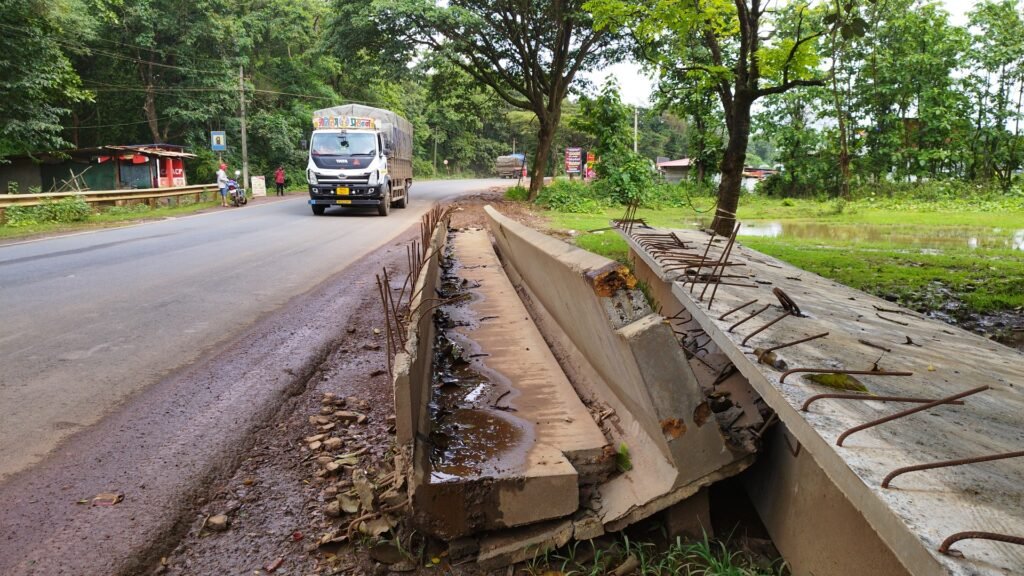 ಕಳೆದ‌ ನಾಲ್ಕು ತಿಂಗಳಿಂದ ಹೆದ್ದಾರಿ ಬದಿಯಲ್ಲಿ ದಡೂತಿಯಂತೆ ಬಿದ್ದಿರುವ ನಾಲ್ಕೈದು ಸಿಮೆಂಟ್ ಸ್ಲಾಬ್ ಗಳು ವಾಹನ ಸಂಚಾರಿಗಳಿಗೆ ಪ್ರಾಣಕಂಟಕವಾಗಿ ಕಾದು ಕುಳಿತಿದೆ.