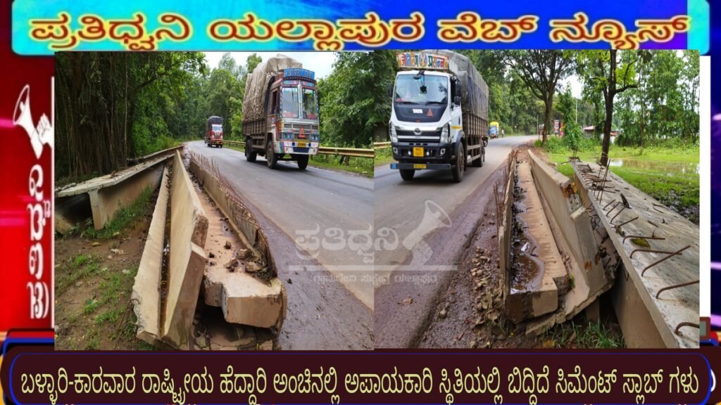 ಪ್ರತಿಧ್ವನಿ,ಯಲ್ಲಾಪುರ : ಪಟ್ಟಣದಿಂದ ಹುಬ್ಬಳ್ಳಿ ಮಾರ್ಗದಲ್ಲಿ ಸಾಗಿದರೆ ನ್ಯೂ ಮಲಬಾರ್ ಹೊಟೆಲ್ ಸಮೀಪ ಬಳ್ಳಾರಿ – ಕಾರವಾರ ರಾಷ್ಟ್ರೀಯ ಹೆದ್ದಾರಿ ಮೇಲೆ ಅಪಾಯಕಾರಿ ತಿರುವಿನಲ್ಲಿ ಗಜಗಾತ್ರದ ಸಿಮೆಂಟ್ ಸ್ಲಾಬ್ ರಸ್ತೆ ಅಂಚಿಗೆ ಅನಾಥವಾಗಿ ಬಿದ್ದಿದ್ದು ಯಾರದೊ ಮನೆಯ ದೀಪ ಆರಿಸಿ ಅನಾಥವಾಗಿಸಲು ಹೊಂಚು ಹಾಕಿ ಕುಳಿತಂತಿದೆ.