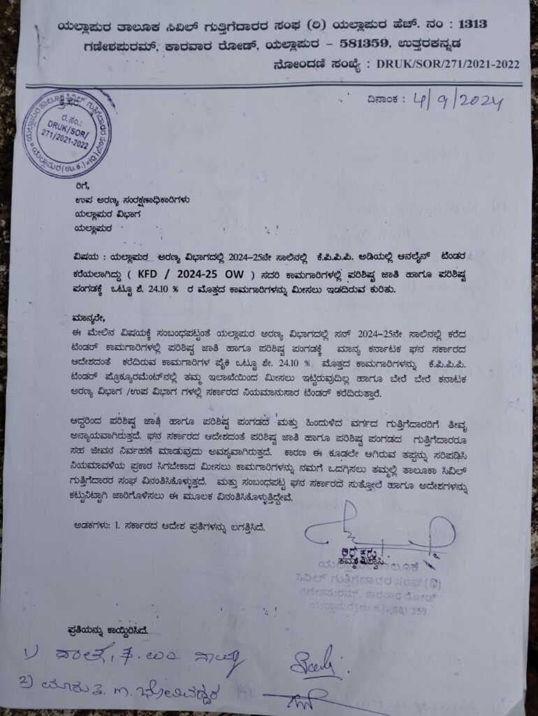 ಕರ್ನಾಟಕ ಘನ ಸರ್ಕಾರದ ಆದೇಶದಂತೆ ಸರ್ಕಾರದ ಕಾಮಗಾರಿಗಳಲ್ಲಿ 24.10% ಮೊತ್ತದ ಕಾಮಗಾರಿಗಳನ್ನು ಪರಿಶಿಷ್ಟ ಜಾತಿ ಮತ್ತು ವರ್ಗಗಳಿಗೆ ಮೀಸಲಿರಿಸಬೇಕಿದ್ದು ಅರಣ್ಯ ಇಲಾಖೆ ಕರೆದಿರುವ ಟೆಂಡರ್ ನಲ್ಲಿ ನಿಯಮ ಉಲ್ಲಂಘಿಸಿದ್ದಾರೆ. ಈ ಕುರಿತು ಗಮನಹರಿಸಿ ಸಮಸ್ಯೆ ಬಗೆಹರಿಸಬೇಕಿದೆ ಎಂದು ಮನವಿಯಲ್ಲಿ ಉಲ್ಲೇಖಿಸಲಾಗಿದೆ.